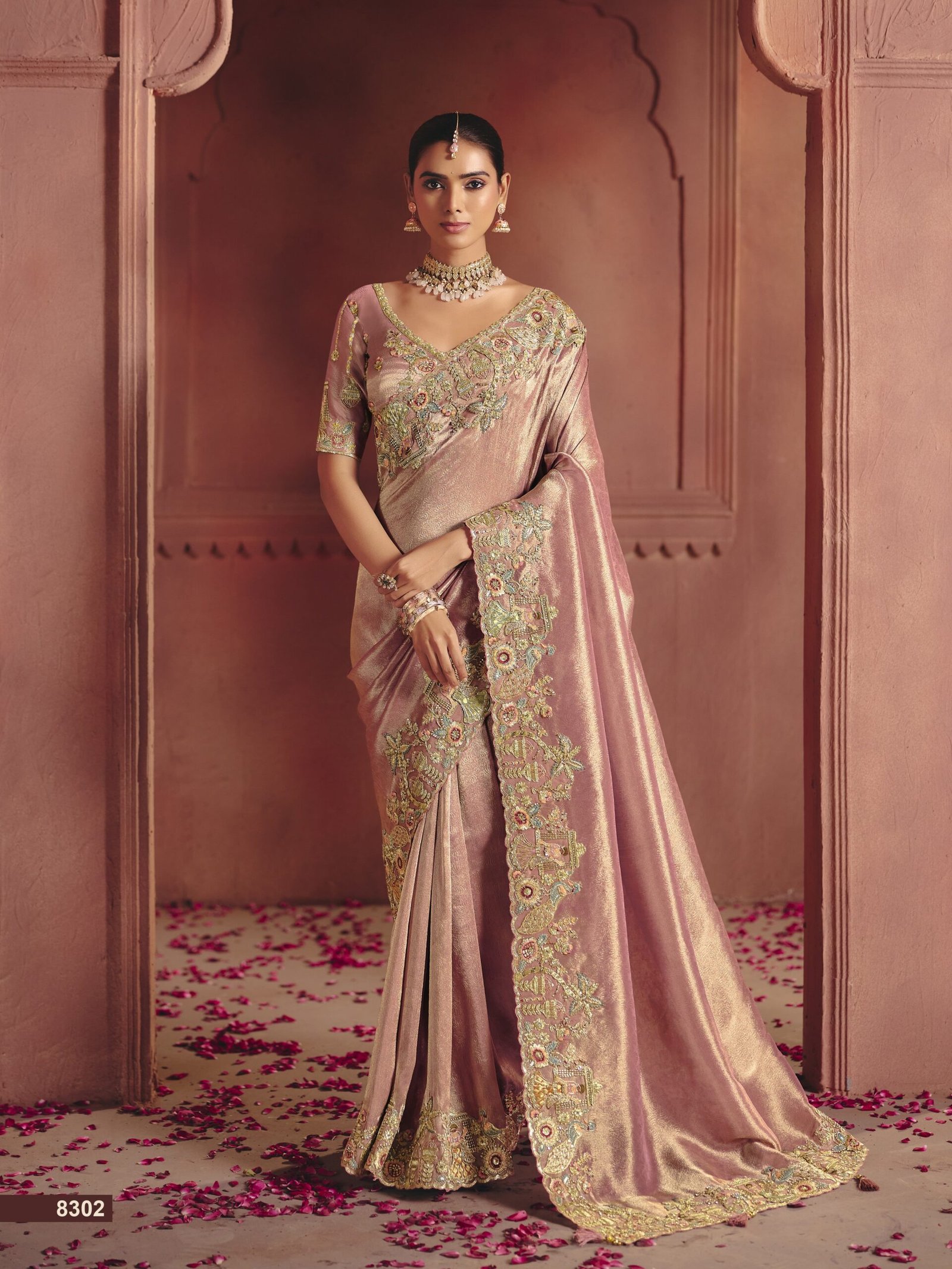 Saree Detail: This luxurious saree features a shimmering rose gold base, framed by a bold traditional scalloped border. The border is meticulously crafted with zari and colored threadwork, finished with a contemporary scalloped edge that adds a touch of modern grace to the classical design.?