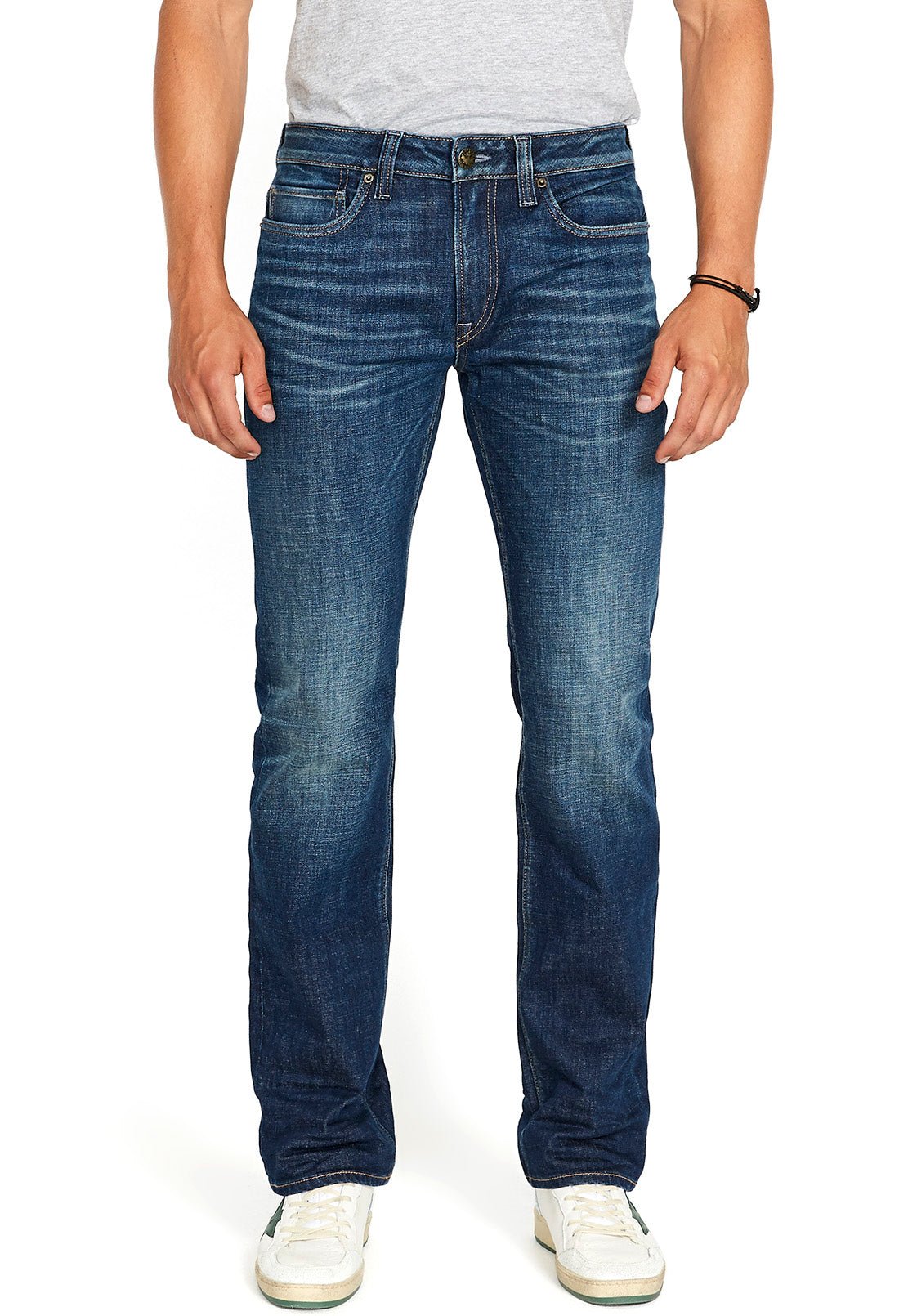 Stretch denim jeans in a sanded dark wash. Features a regular rise with a relaxed fit throughout the leg. The rivet at the back pocket adds subtle detailing. Part of our AUTHENTIC collection, this jean offers rich textures and long lasting denim with just the right amount of stretch.