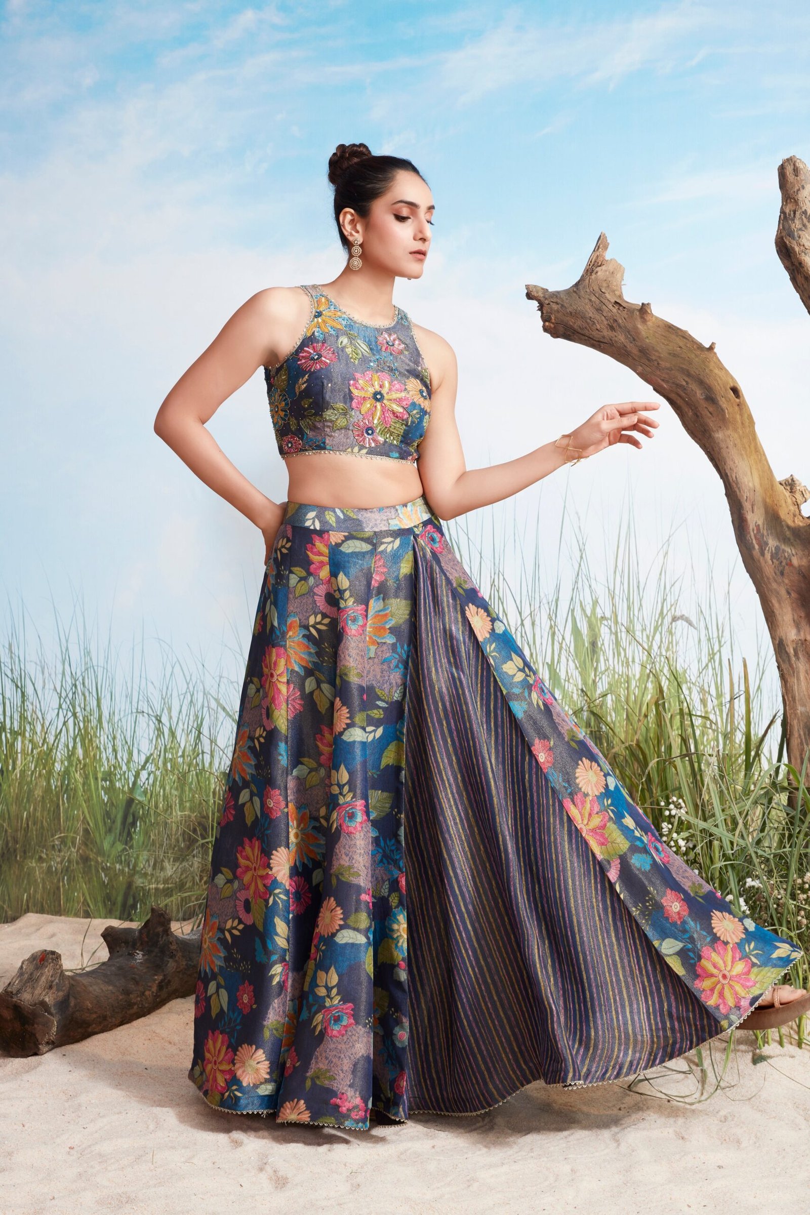 This luxurious two-piece ensemble features a deep, sophisticated base color accented by vibrant floral patterns and intricate handwork. It includes a sleeveless Crop Top Blouse with a high neckline and a stylish back keyhole cutout, paired with a voluminous Skirt that incorporates a modern split design revealing a contrasting striped panel.