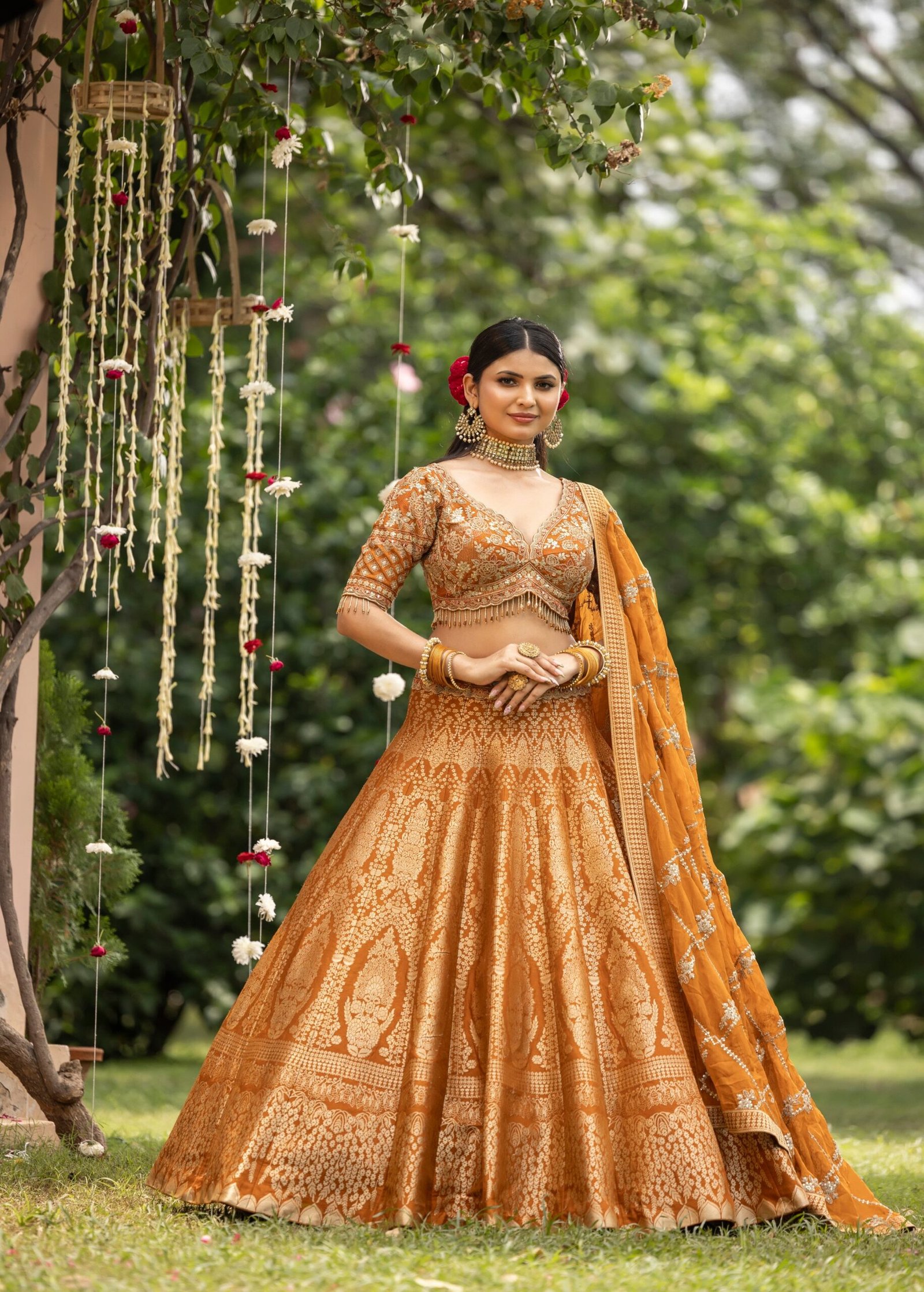 This regal three-piece Banarasi silk ensemble features a voluminous lehenga and sweetheart-neckline blouse. Both pieces are lavishly adorned with golden dori, zarkan, mirror, and stone work. The look is completed with a matching dupatta featuring heavy embroidered borders.