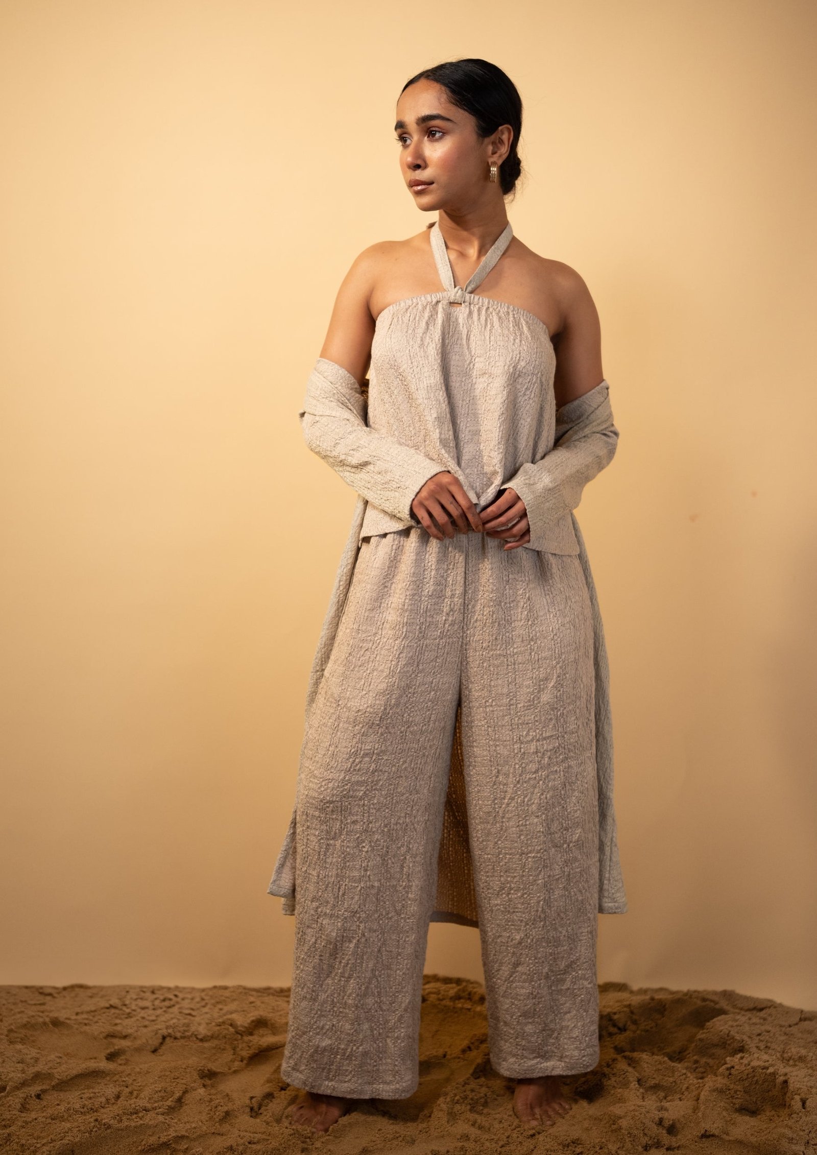 Inspired by sun-washed shores and the calm of slow holidays, this 3-piece beach set blends understated luxury with effortless comfort. The textured sand-beige fabric moves softly with every breeze ? from the halter inner to the flowy overlay and relaxed wide-leg pants. Designed for beach escapes, poolside lounging, and elevated resort days, it?s a versatile neutral that styles beautifully across seasons.