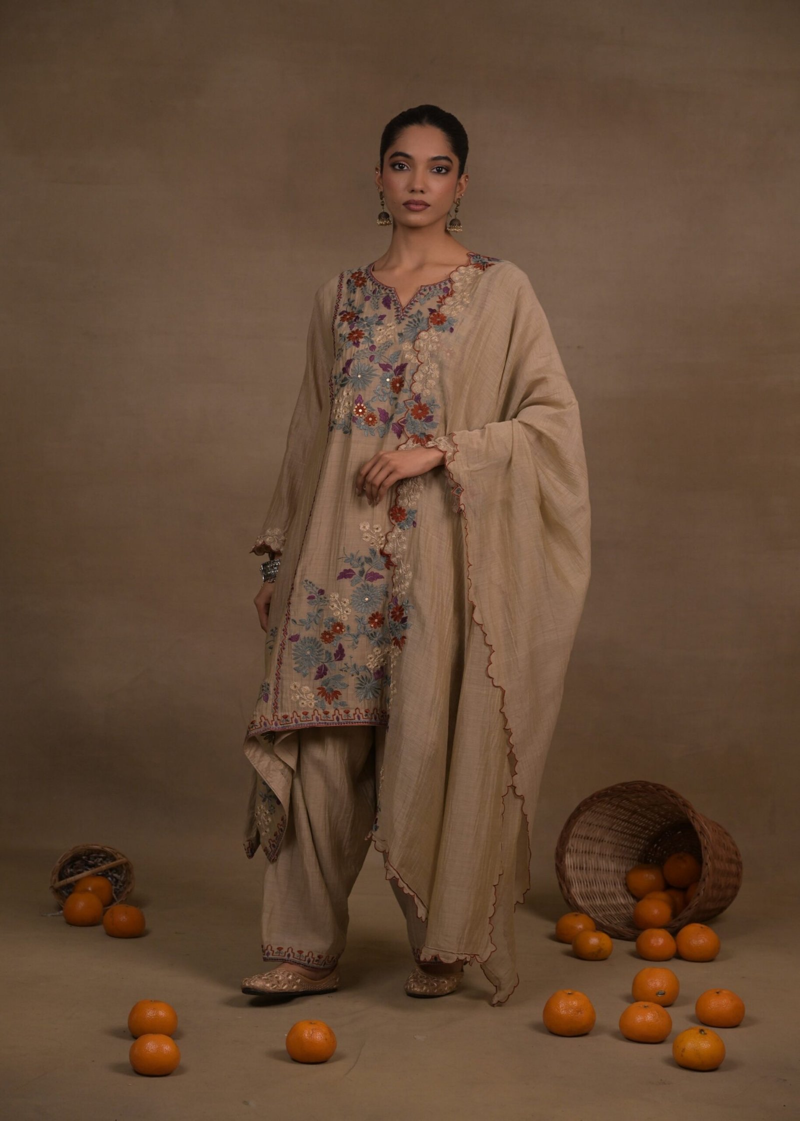 Kurta Detail: This ensemble features a contemporary high-low kurta designed for a fluid, breezy silhouette. The front panel is adorned with vibrant multicolour floral embroidery in earthy red, cornflower blue, and plum tones, beautifully contrasted against the neutral beige base. Detailed ivory thread-work runs along the asymmetric hem and V-neckline, while the sleeves are finished with delicate embroidered cuffs.