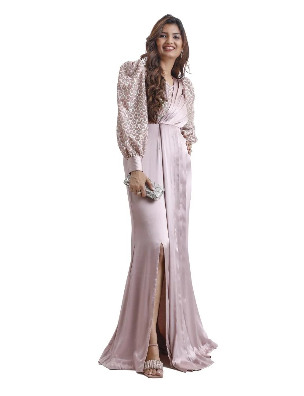 Product DetailsType: Draped dressFit: Slim fitNeckline type: V necklineSleeves styling: Bishop sleevesFabric: SatinColor: PinkLength: Floor lengthOccasion: Partywear
