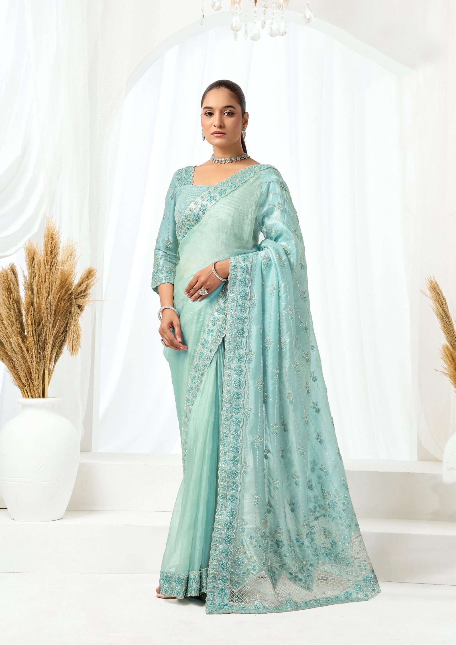 Saree Detail: A vision of coastal elegance, this seafoam net saree is defined by its artisanal details. The pallu and borders are heavily encrusted with pearls, beads, and sequins, forming a series of ornate floral medallions and scalloped edges. The body of the saree features delicate scattered floral, while the heavy mono net fabric provides a beautiful sheen that catches the light brilliantly.