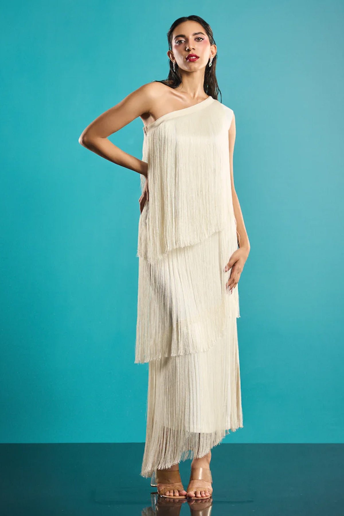 Serene white statement one shoulder fringe layered dresses