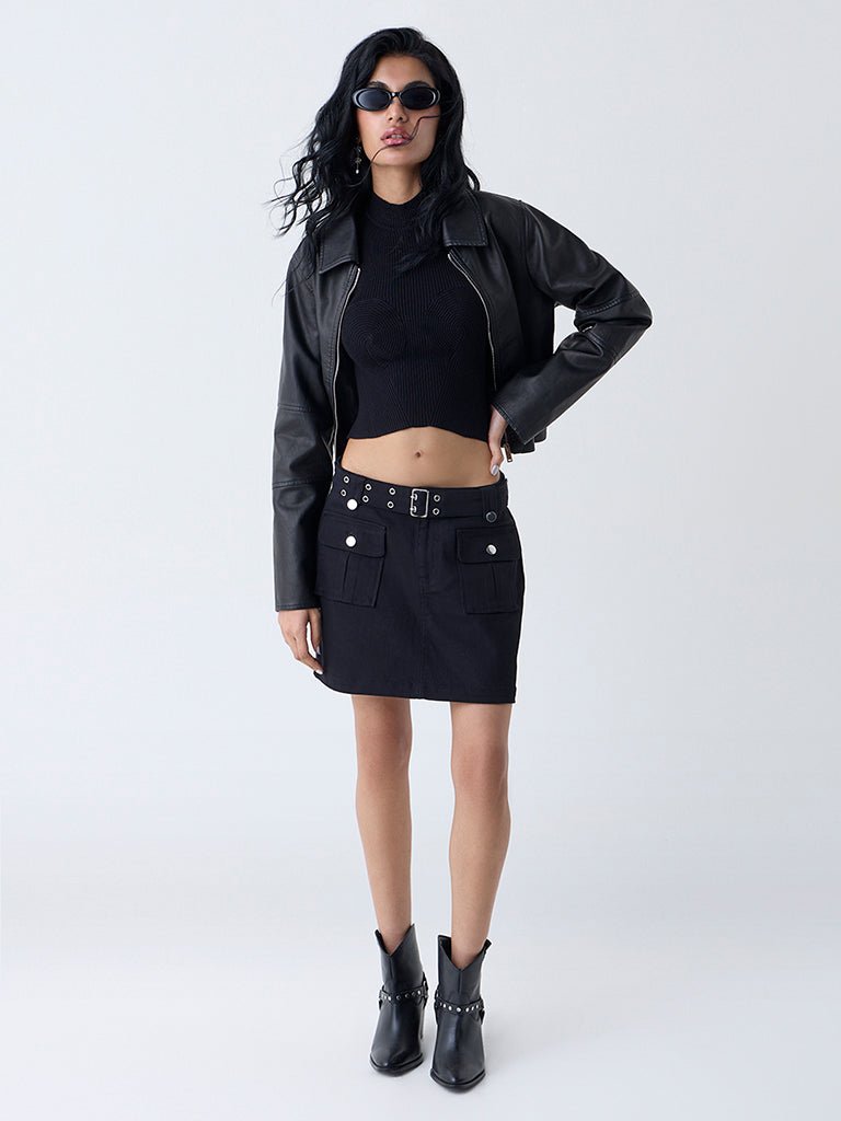 Designed for days that need both comfort and edge, this black denim skorts from is cut in a high-rise silhouette for a clean fit. Made from pure cotton, it features a button-zipper fly, belt loops and front patch pockets. The matching belt with buckle completes the look, making it an easy go-to for everyday styling.