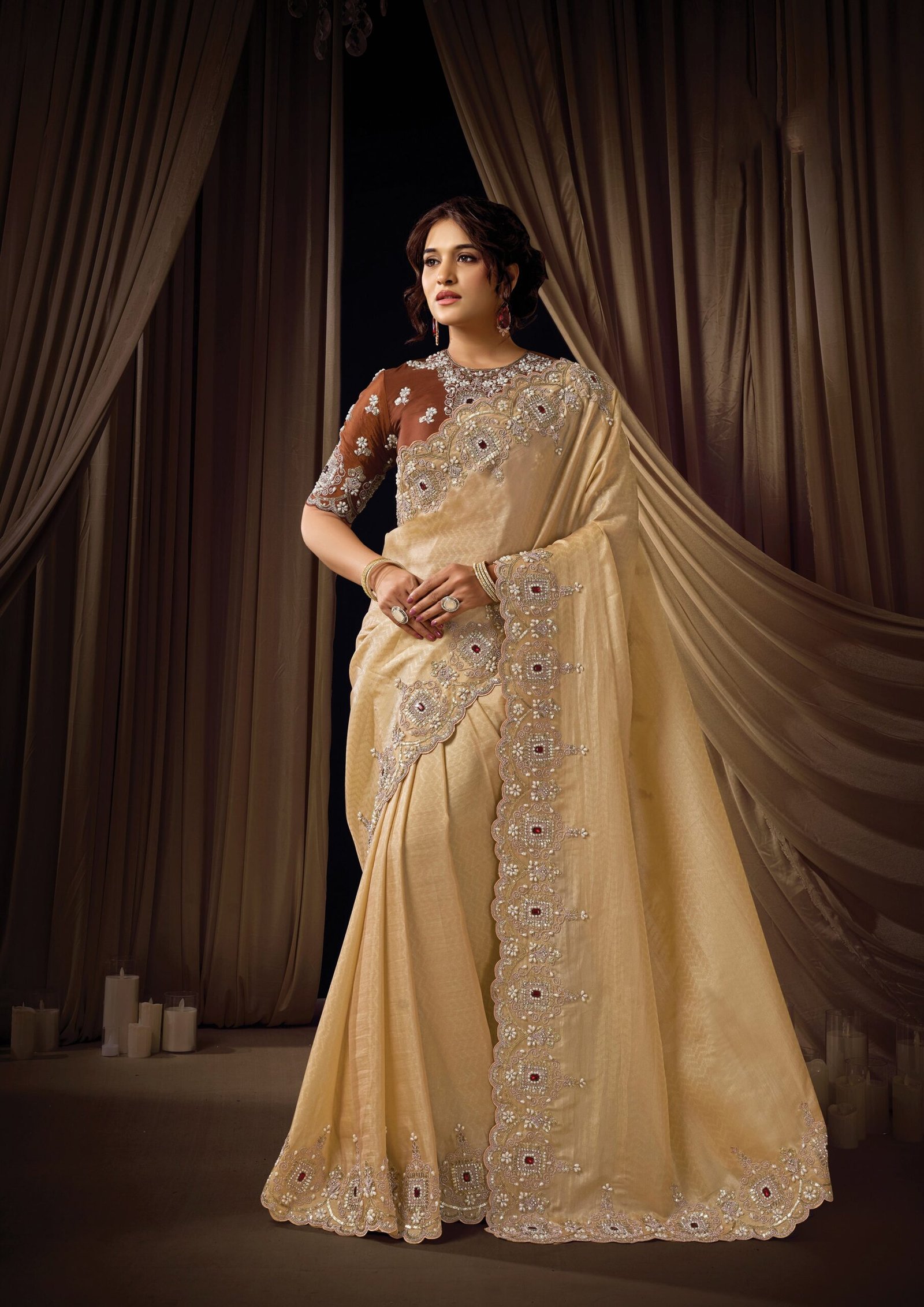 Elegant soft beige saree crafted from luxurious woven jacquard silk, offering a rich texture with a graceful drape. The saree is beautifully adorned with intricate embroidery highlighted with shimmering sequins, pearl accents, and crystal shine stones, creating a refined and festive appeal. It is paired with a contrasting brown unstitched blouse fabric made from crepe satin silk, allowing you to tailor the blouse according to your preferred style.