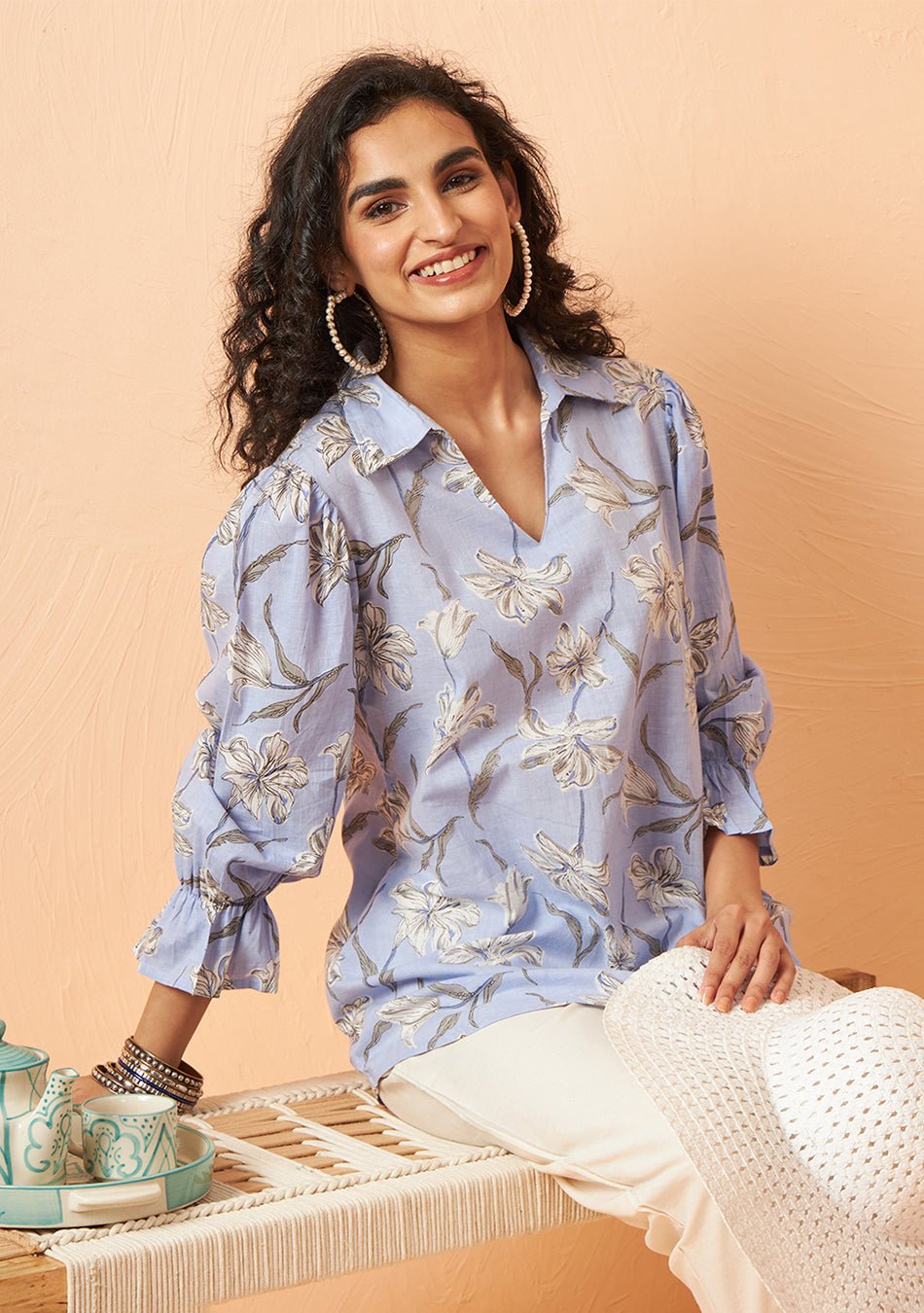 The Serene Blossom Top in a powder blue color features a delicate leaf pattern, exuding a sense of tranquility and elegance. Perfect for any occasion, this top combines a soothing color palette with a graceful design, making it a versatile and stylish choice.
