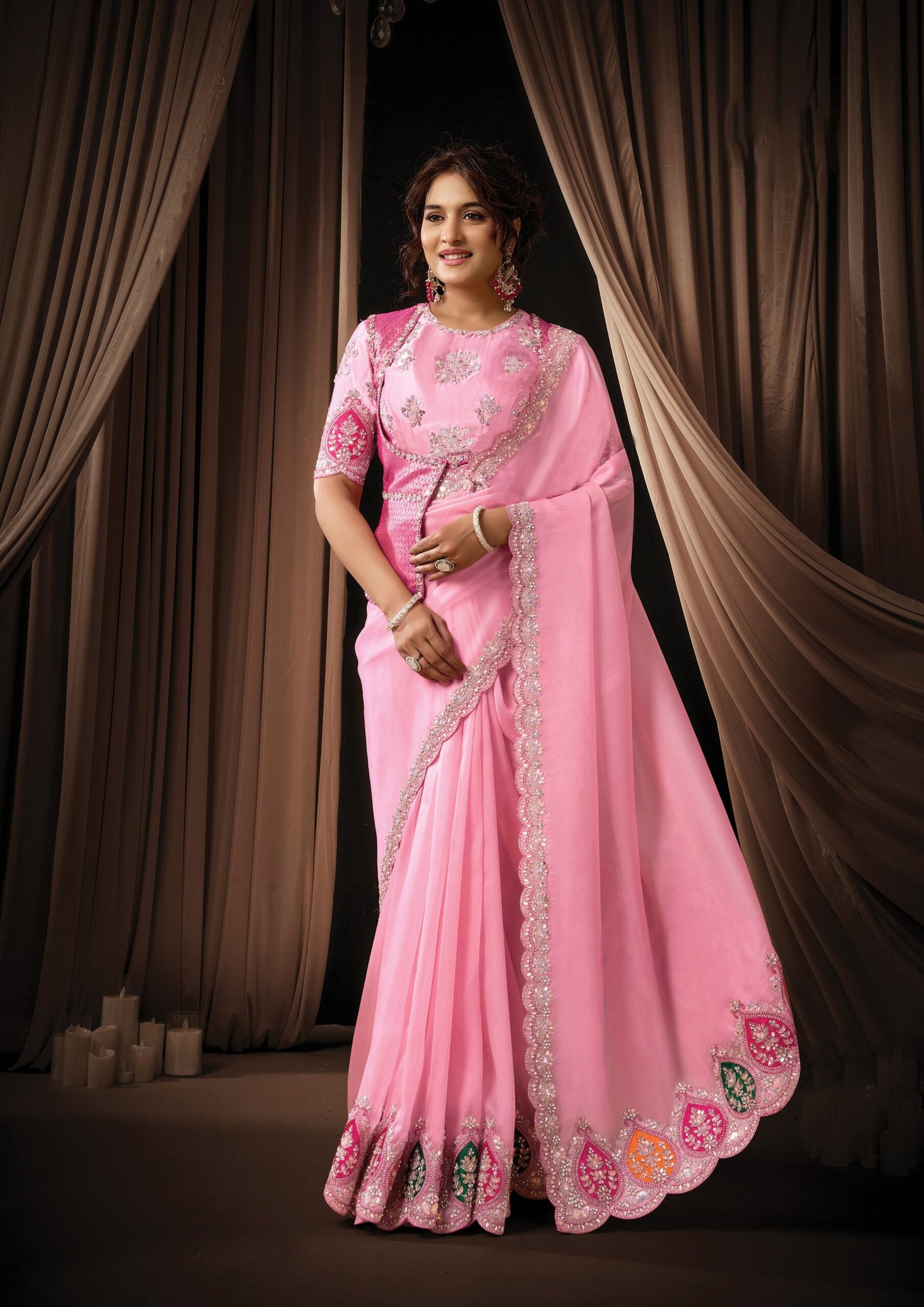 Graceful soft pink saree crafted from luxurious tissue organza silk, offering a lightweight drape with a subtle, elegant sheen. The saree is beautifully detailed with multi-thread embroidery, highlighted with shimmering sequins, stone embellishments, and intricate handwork for a refined festive look.