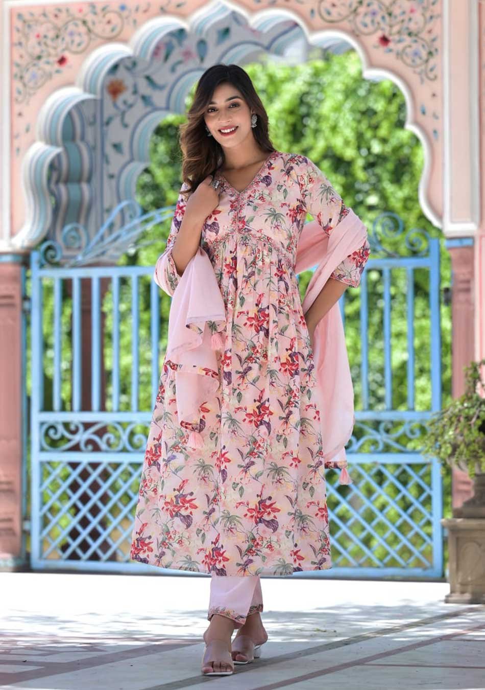 This Pink Anarkali is perfect for a breezy and light look. The colorful floral print on the suit adds a touch of femininity.
