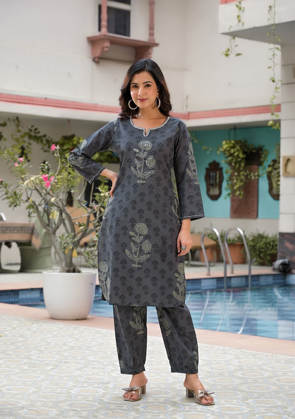 Elevate your style with our Steel Grey Hand Block Print Co-ord Set, adorned with exquisite hand embroidery on the neckline. This intricate detail adds a touch of sophistication, making it a uniquely crafted ensemble that stands out with elegant flair.
