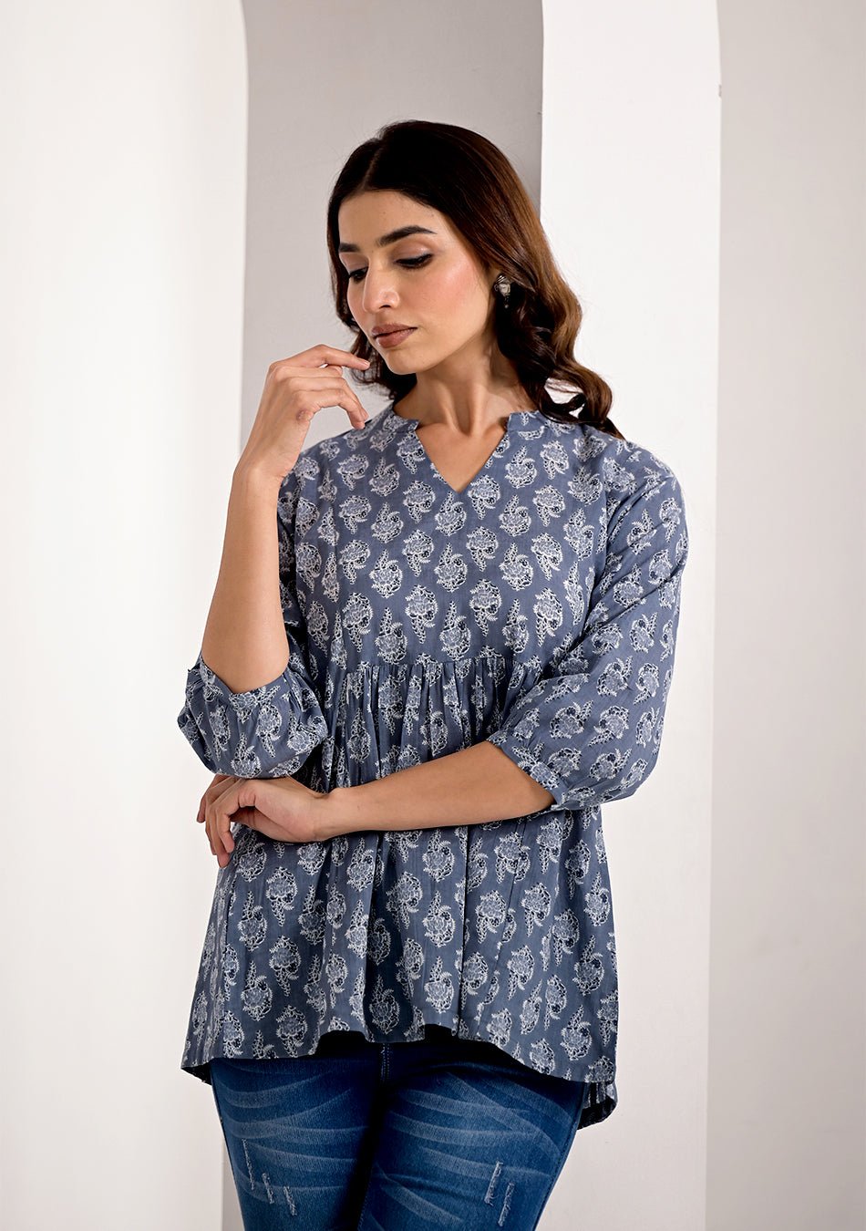 This peplum top is crafted in cotton.I t features a wide V neckline, three fourth puffed sleeves and a front button down. You can pair it with white tapered pants, a nice pair of shoes and a cute bag or clutch and it will have you shining for a fun day in the sun.