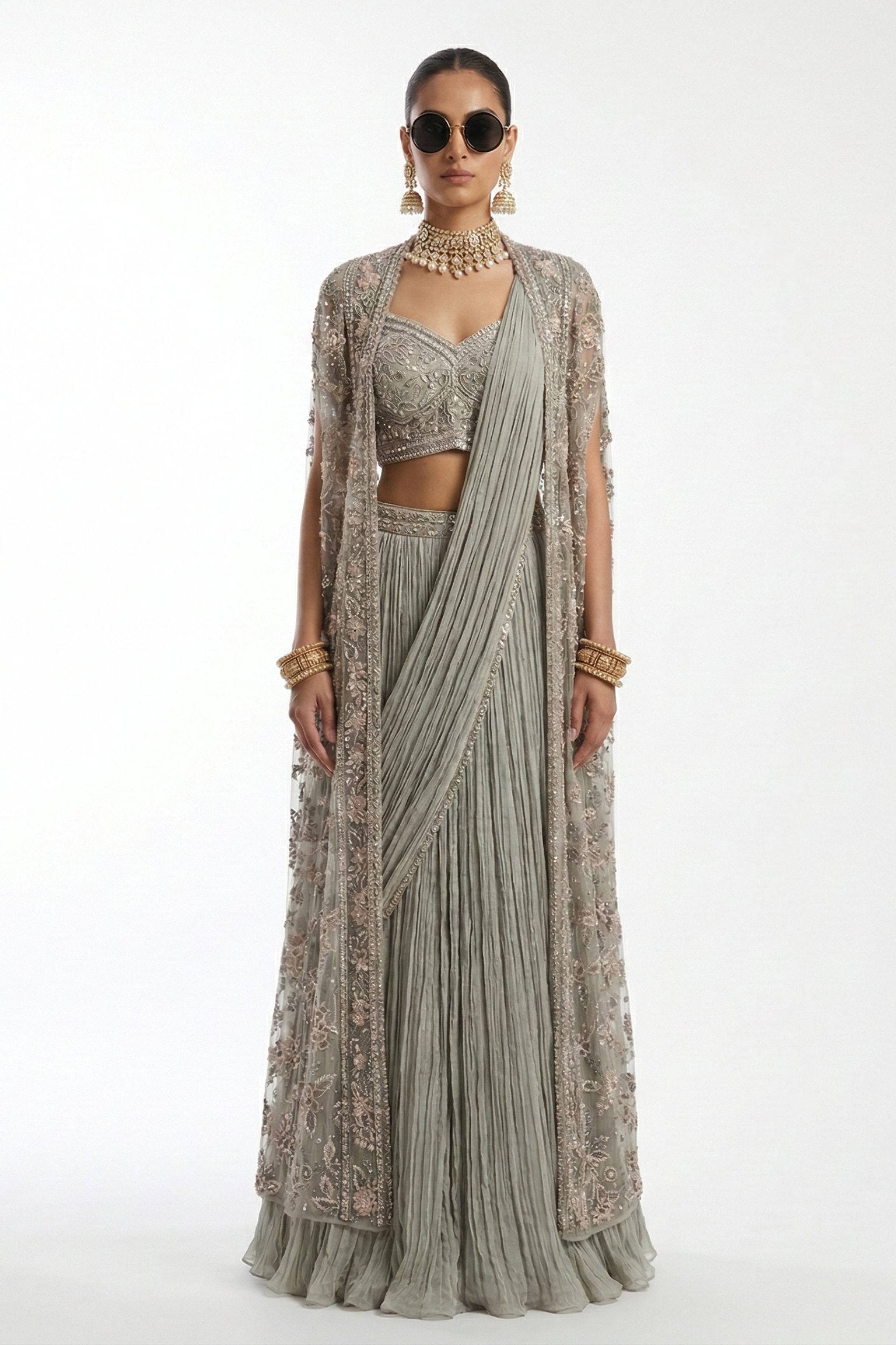 This ethereal silver ensemble features a three-piece modern fusion silhouette, including a crop top, a pre-draped saree, and a floor-length sheer cape. The set is defined by its intricate sequin embroidery, with the floor-length cape showcasing delicate shimmering threadwork throughout. The crushed chinon silk fabric of the skirt provides a beautiful textured contrast to the heavily embellished bodice, creating a look that is both airy and opulent.?