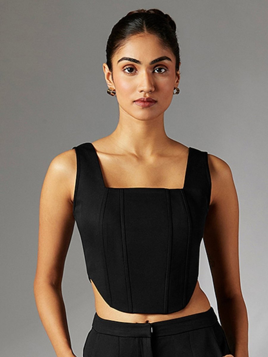 The Lux Edit : Refine your evening wardrobe with the stunning Dina Set. This sophisticated ensemble features a black corset top with intricate detailing and matching straight-fit trousers, both crafted from luxurious Italian banana crepe. The structured silhouette of the corset top creates a captivating focal point, while the tailored trousers offer a sleek and timeless aesthetic.