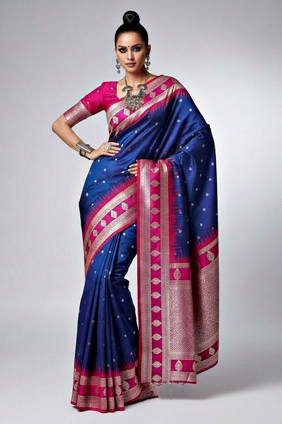 Navy Blue and Red Silk Saree with Traditional Woven Design