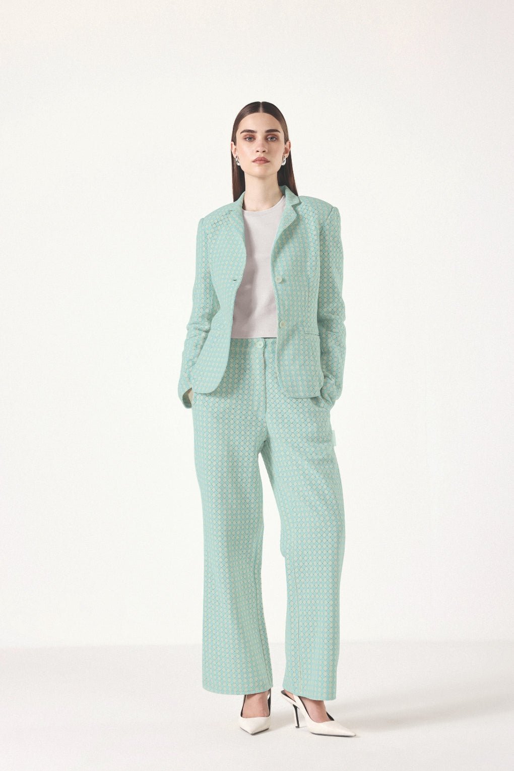Introducing our Summer’ Loom Crochet Co-ord Set?the ultimate summer ensemble that effortlessly blends elegance with breathable comfort. This sophisticated set features a regular-fit blazer crafted from delicate crochet fabric, offering a lightweight, airy feel with a refined silhouette. Paired seamlessly with wide-leg pants in matching crochet fabric, this set delivers a structured yet relaxed fit that flows beautifully with every step.
