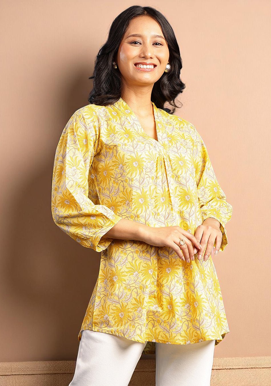 The Sunflare Bloom Pleated Top features a vibrant yellow floral print inspired by sun-kissed blooms. Crafted in soft cotton, it offers a relaxed fit with a longline silhouette?perfect for brightening up casual days with effortless charm and comfort.