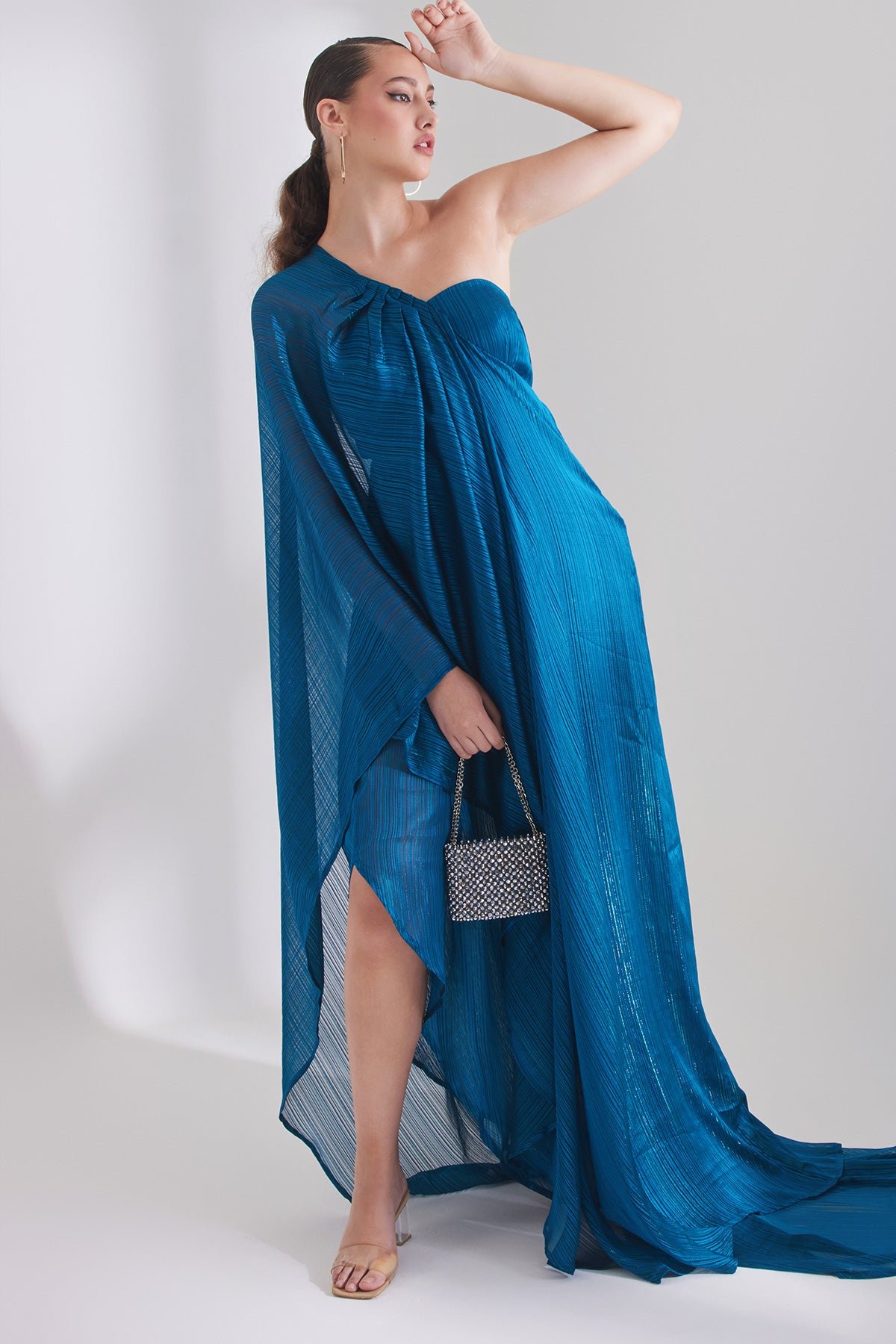 Featuring the lurex chiffon teal one-shoulder trail havan dress FABRIC: Exclusive chiffon georgette