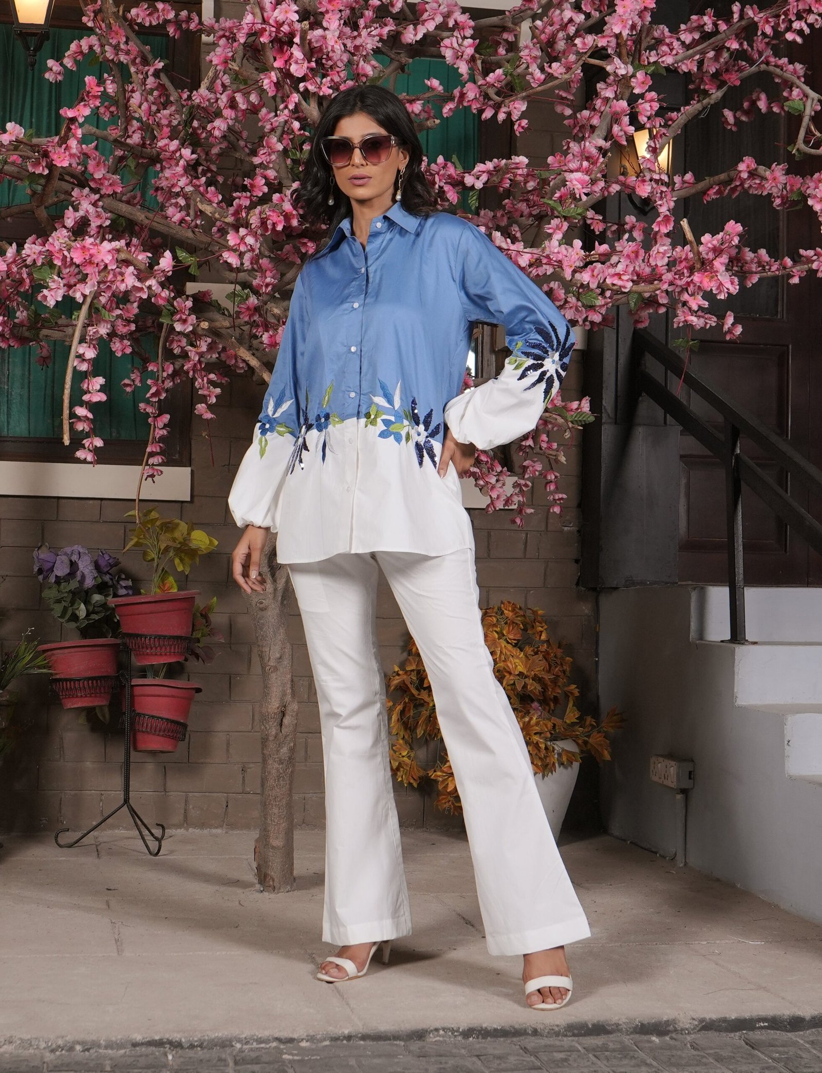 Step into effortless elegance with the two tone flora set. Featuring a soothing blend of soft blue and white, this full sleeve shirt is adorned with delicate floral embroidery that blooms around the hem and sleeves. The sleeves are finished with a gentle elastic cuff for added volume and comfort. Paired with classic white bell ?bottoms, this look balances bold charm with realxed style- perfect for garden brunches or casual evenings out.