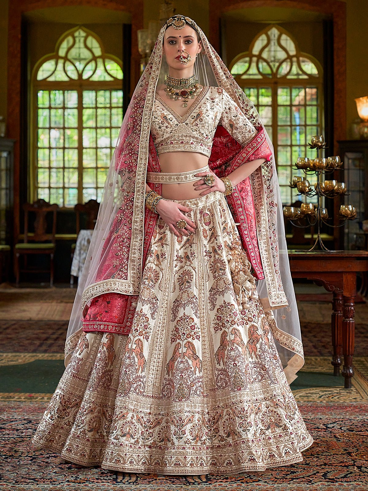 Elevate your wedding day style with this exquisite off-white silk bridal lehenga, a masterpiece designed for the modern bride who cherishes traditional craftsmanship. The premium silk fabric provides a rich, lustrous base for the intricate artistry that defines this ensemble, featuring a sophisticated blend of heavy embroidery, shimmering sequins, and delicate thread pearl work. The highlight of this traditional attire is the masterful zari weaving that covers the lehenga and matching silk blouse, creating a timeless look that radiates elegance and luxury for any grand wedding ceremony.