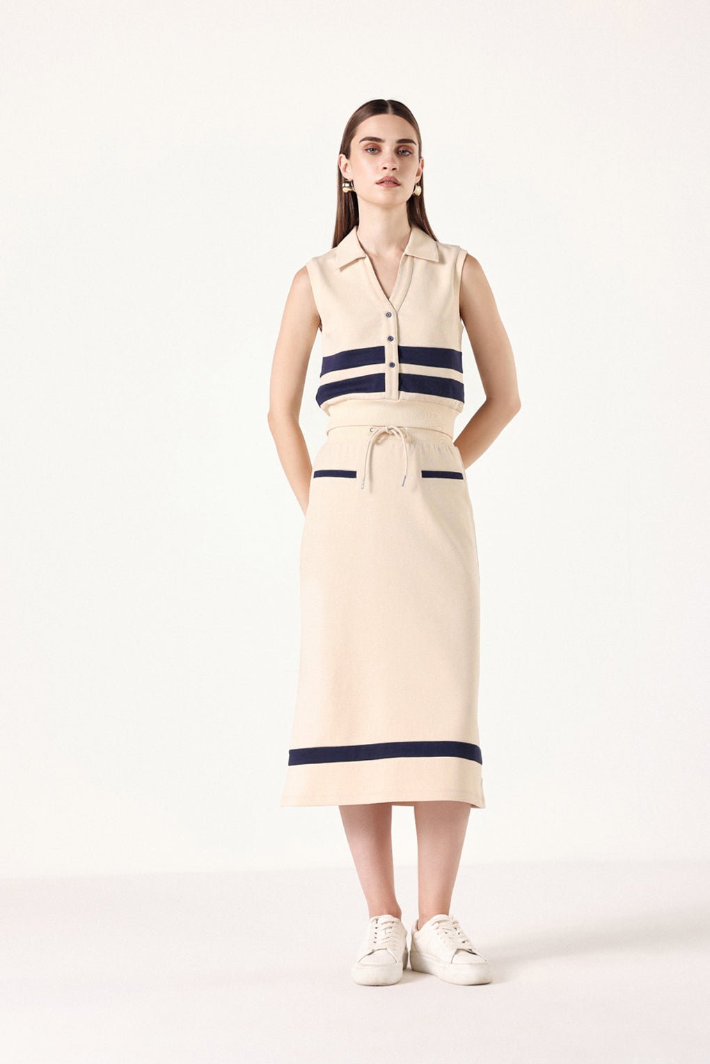 Style it as a complete look with our matching co-ord set, featuring a sleeveless vest top with a classic collar and button-front design in cream knit, detailed with navy stripes across the midsection, paired with a coordinated midi skirt with an elasticated waist and a straight silhouette for effortless chic.