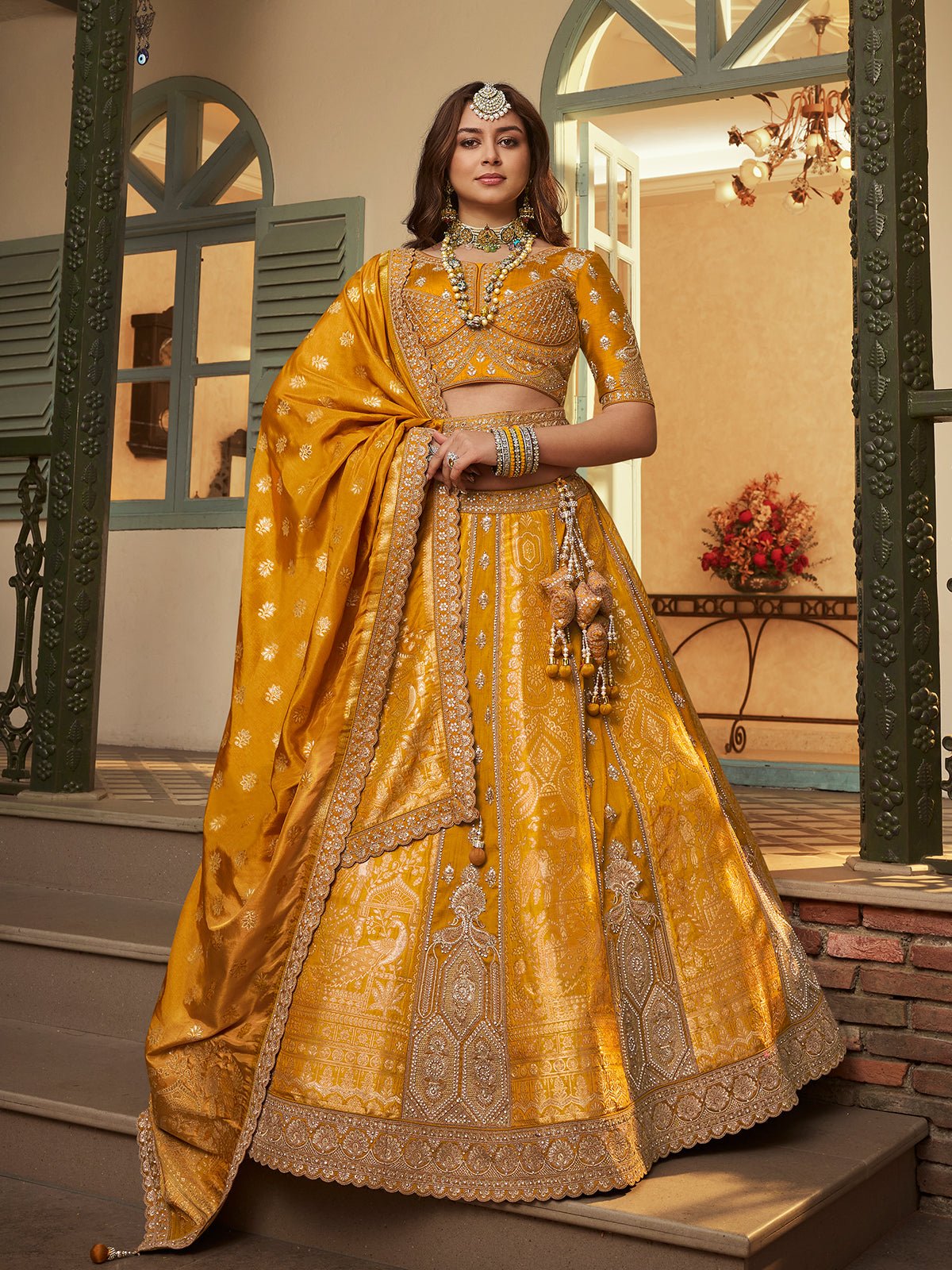 Yellow Banarasi Silk Embroidered Wedding Chaniya Choli