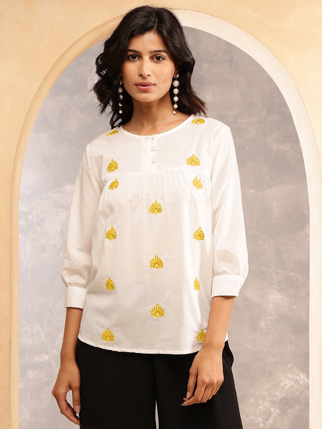 The Yellow Floral Pop Top is a fresh, playful cotton tee featuring a vibrant red flower embroidery on a crisp white base. Perfect for casual wear, it offers a comfortable, breathable fit with a fun, stylish design.