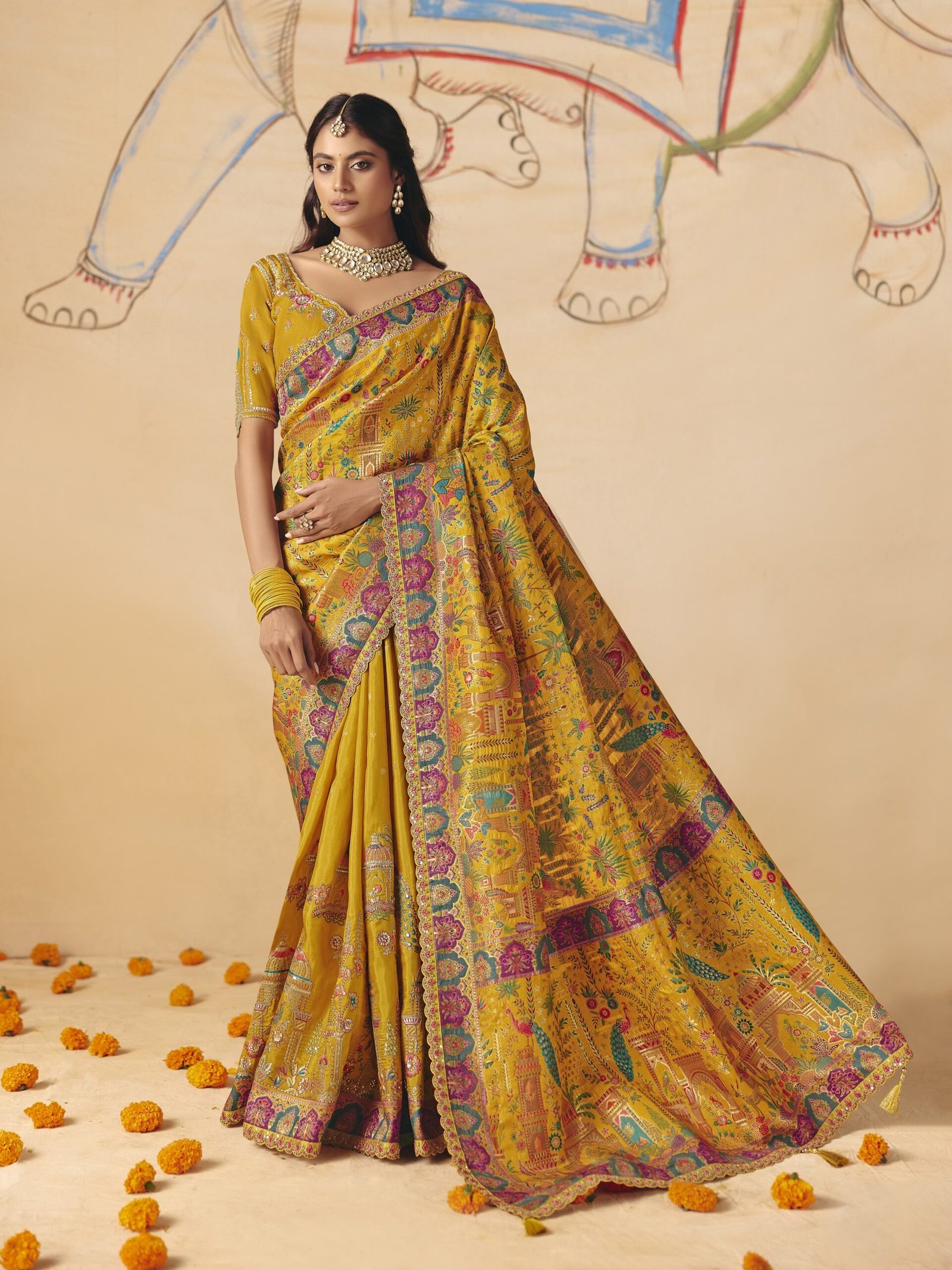 This bright yellow silk saree features a classic, regal silhouette with a luxurious drape and a rich natural sheen. The ensemble is intricately detailed with all-over golden thread embroidery and shimmering sequin work, creating elaborate floral and architectural motifs. High-definition position printing in multi-colored tones adds depth to the pallu, while the scalloped borders ,the matching blouse is available in both unstitched and stitched options, featuring a generous blouse piece length of 1.2 meters.