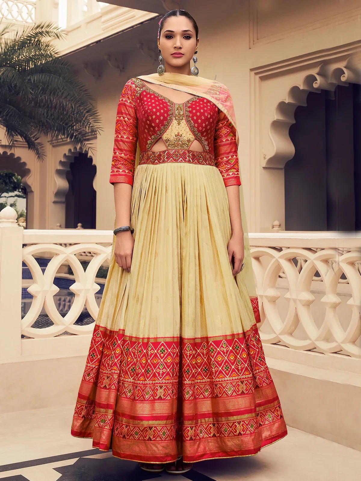 Material Type: Indo-Western LehengaColor: Yellow-RedFabric: P.V Silk With Foil Print Or HandworkOccasion: Wedding Wear, Reception Wear, Pre-Wedding Wear
